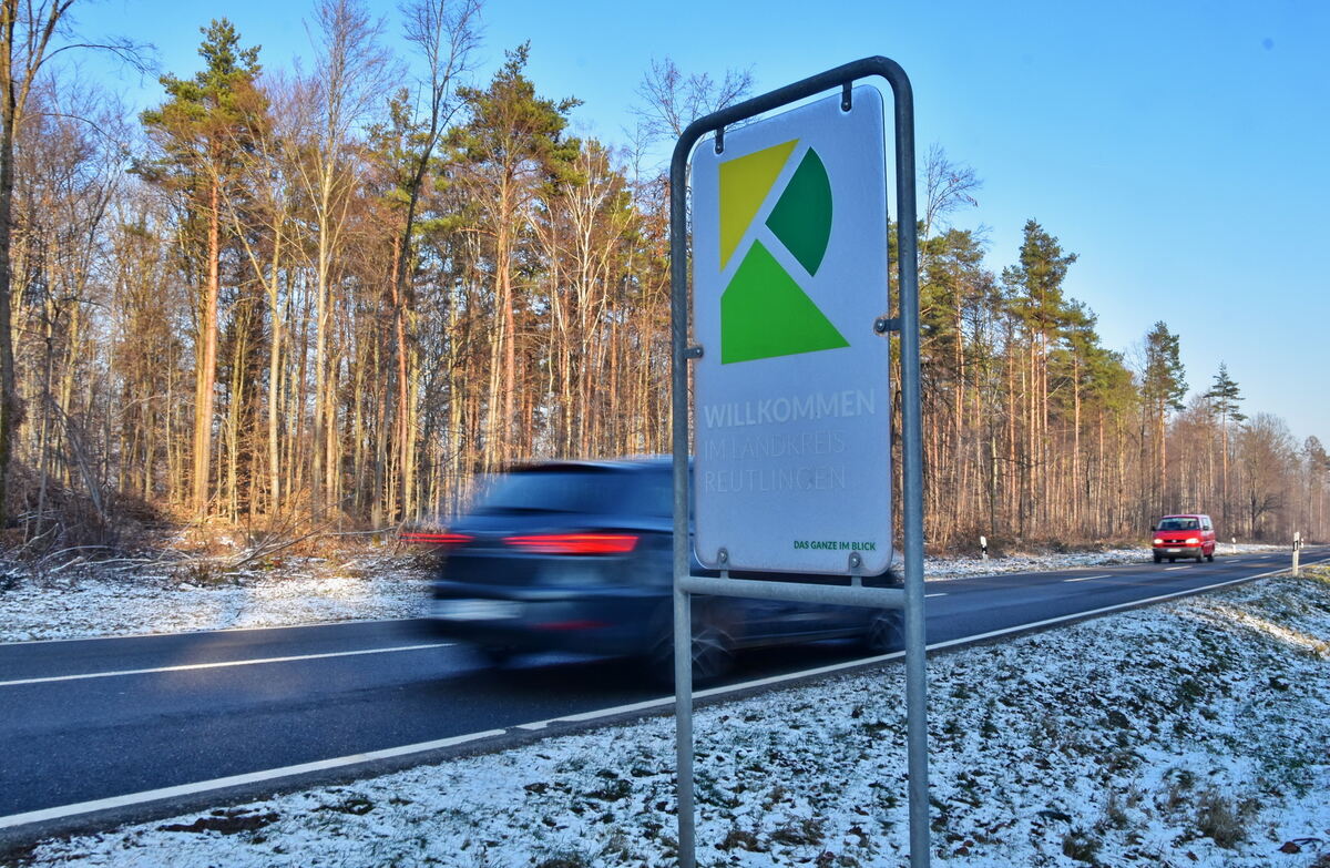 So ähnlich könnte es aussehen: Eines von 13 Willkommensschildern des Landkreises Reutlingen, hier an der B 464 zwischen Dettenhausen und Walddorfhäslach. Allerdings ist hier der Schriftzug schon etwas verblasst. FOTO: MEYER