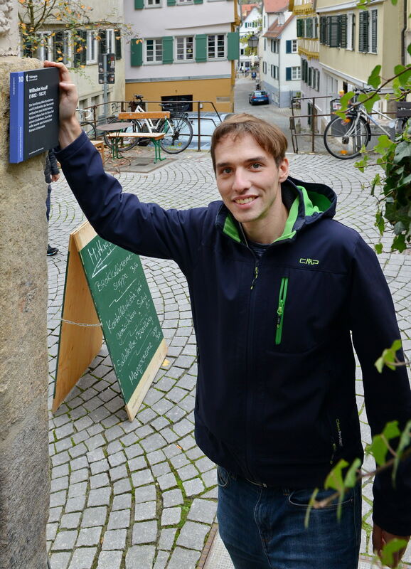 Am Wohnhaus von Wilhelm Hauff in der Haaggasse 15. Florian Mittelhammer mit der kleinen Plakette, die auf eine der 40 Stationen aufmerksam macht. foto: niethammer
