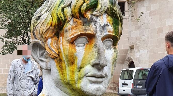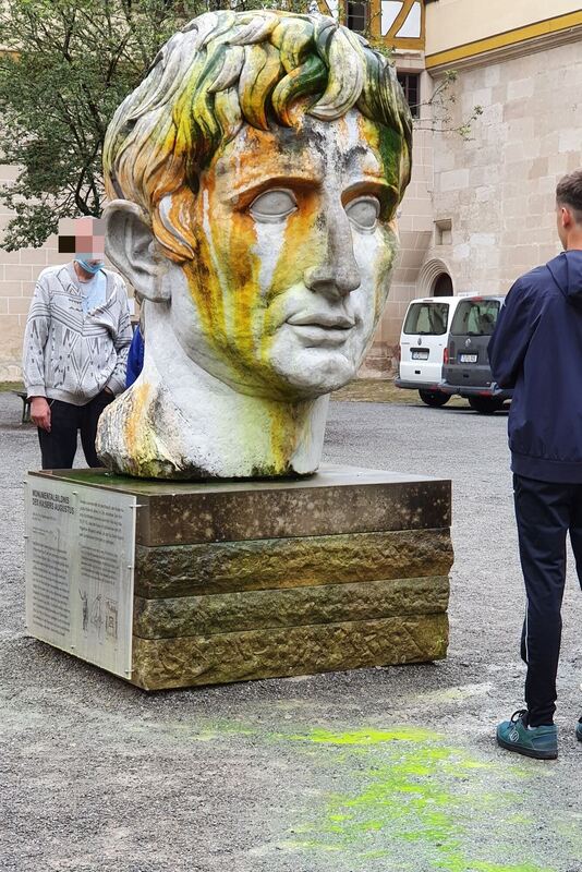 Die Marmor-Skulptur im Hof wurde im Zuge der durch Dr. Kathrin Zimmer im Jahr 2013 im MUT auf Schloss Hohentübingen kuratierten Ausstellung »Täuschend echt« im Zentrum des Schlosshofes errichtet. Sie stammt vom Allgäuer Bildhauer Michael Pfanner und wurde bereits für eine Ausstellung in der Münchner Antikensammlung auf dem dortigen Königsplatz verliehen und aufgestellt. Der große Augustuskopf entwickelte sich mittlerweile zu einem der beliebtesten Fotomotive Tübingens für die Besucherinnen und Besucher auf dem Schloss. Die durch den Anschlag erfolgten Farbeinwirkungen werden seit mehreren Tagen minutiös durch den Restaurator der Klassischen Archäologie, Sönmez Alemdar, behoben. Jedoch sind manche Partien des Marmors derart eingefärbt, dass sie in den porösen Marmor einzogen, weshalb das gänzliche Verschwinden der Farbe sicher Monate, wenn nicht Jahre, dauern wird.