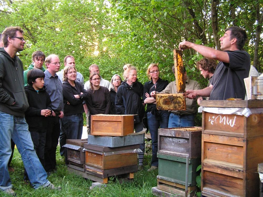 Erste Schritte in die Praxis: Kursleiter Andreas Oelkrug (rechts) zeigt den Neuimkern den Umgang mit Bienen. FOTO: WEBER
