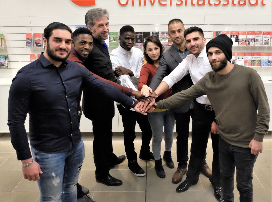 Erfolgreicher Start des Ausbildungs-Stipendiums: Geflüchtete, die das erste halbe Jahr absolviert haben, mit dem Tübinger Oberbürgermeister Boris Palmer. FOTO: HAAS