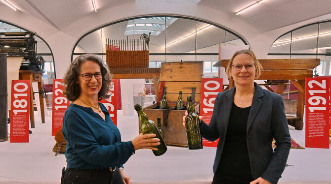 Ein Prosit auf die gelungene Mössinger Stadtjubiläumsausstellung Kulturamtschefin Silvia Maier und Museumsleiterin Franziska Blum stoßen mit historischen Bierflaschen an.