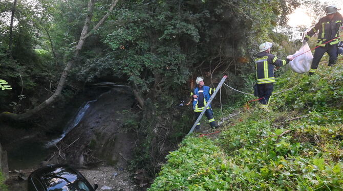 MÖSSINGEN-ÖSCHINGEN. Spektakulärer Rettungseinsatz am Mittwochmorgen auf der Landesstraße 383 zwischen Mössingen und Öschingen. Ein 60-jähriger Autofahrer war bei der Brücke über den Öschenbach mit seinem Wagen rund zwölf Meter in die Tiefe gestützt. Der schwerverletzte Mann musste über eine Schaufeltrage aus dem schwer zugänglichen Bachbett gerettet werden. Er wurde mit einem Rettungshubschrauber in eine Tübinger Klinik geflogen.