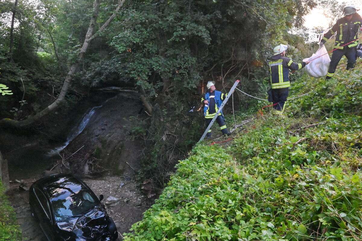 Die Alarmmeldung war gegen sieben Uhr bei der Leitstelle aufgelaufen. Unter glücklichen Umständen. Denn die dicht bewachsene Unfallstelle ist weder von der Straße noch von dem parallel führenden Radweg aus zu sehen. Das verunfallte Auto, ein Mercedes neuerer Bauart, ist mit einem sogenannten eCall-System ausgestattet. Der Bordcomputer löst dabei eigenständig den lebensrettenden Notruf mit GPS-Angabe aus. Kurz danach meldeten eine Autofahrerin und zwei weitere Männer das Unglück mittels Handy. Sie waren zufällig Augenzeugen des Geschehens.