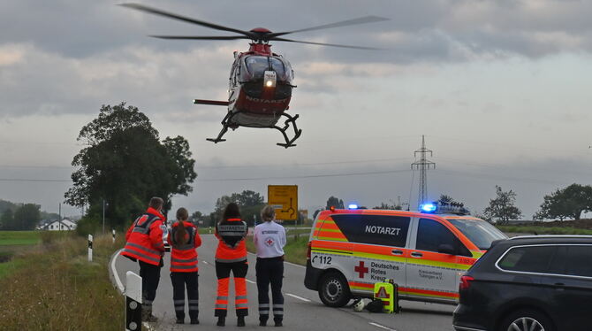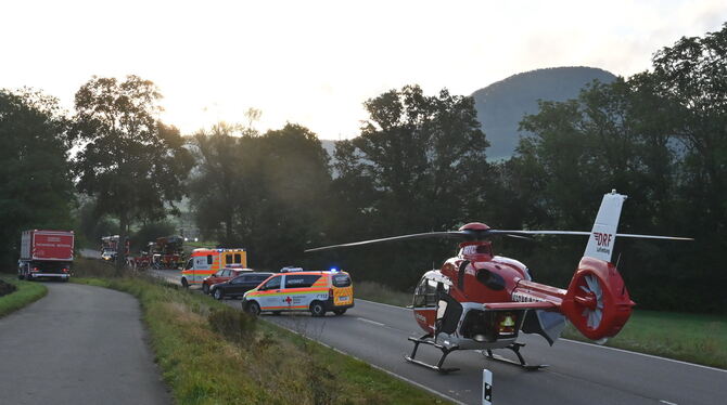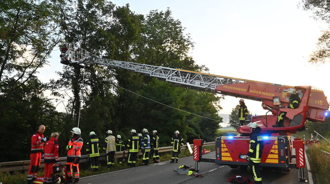 Die Helfer retteten den Mann mittels einer Schaufeltrage. Nach notärztlicher Erstversorgung wurde er auf dem Luftweg abtransportiert. Für die Bergung des Autos wurde ein Autokran eingesetzt. Die Landesstraße war am Morgen von der Polizei voll gesperrt worden. (GEA)