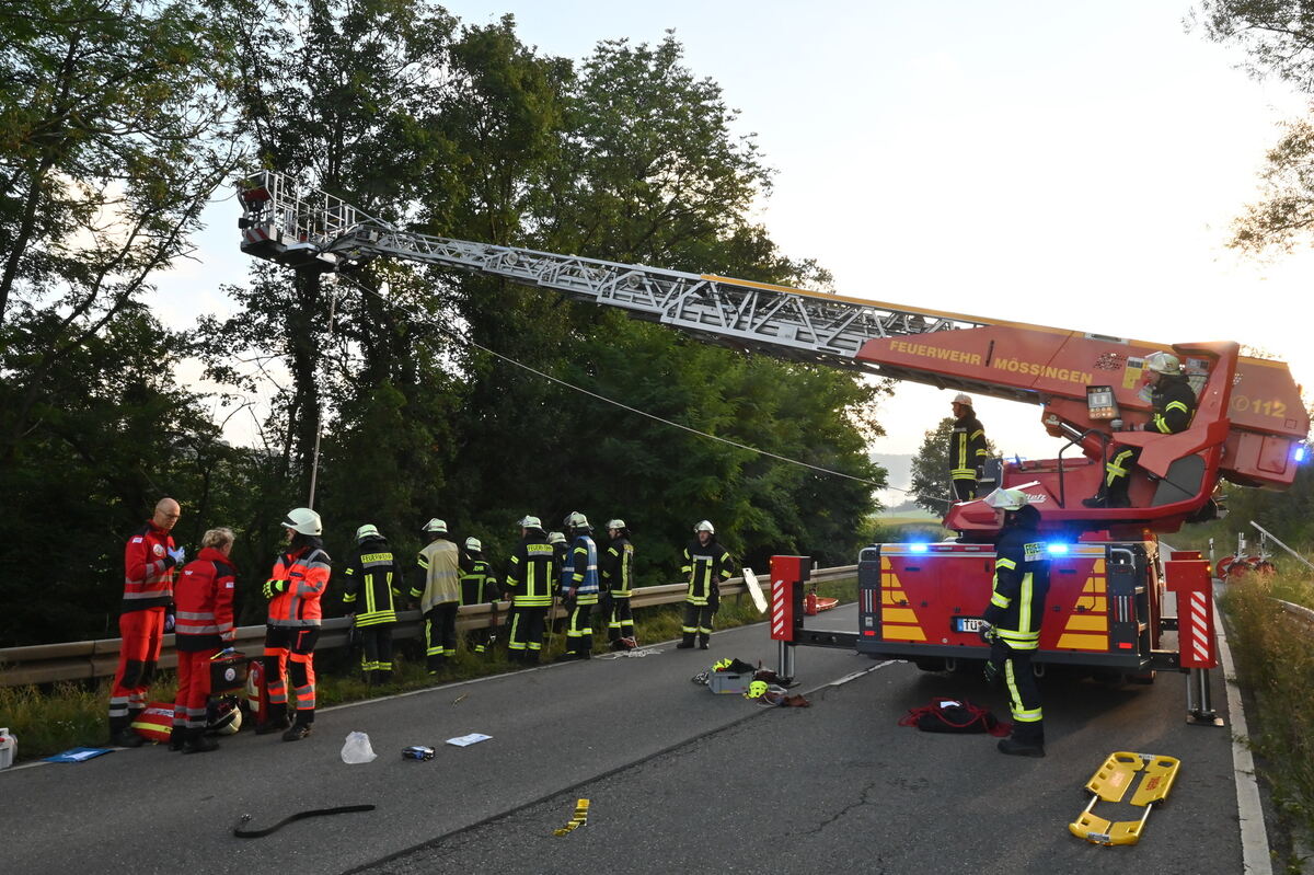 Die beiden Autofahrer stiegen in das schwer zugängliche Bachbett und leisteten Erste Hilfe. Wenig später waren DRK-Rettungs- und Notarztwagen vor Ort, ebenso der Rüstzug der Mössinger Feuerwehr Stadtmitte. Nachalarmiert wurden daraufhin ein Rettungshubschrauber und die Drehleiter. Außerdem, weil geringe Mengen Schmierstoffe ausgelaufen waren, ein Wechselladerfahrzeug für die Technische Rettung, um zu verhindern, dass Öl im Bach weiter in die Steinlach fließt.
