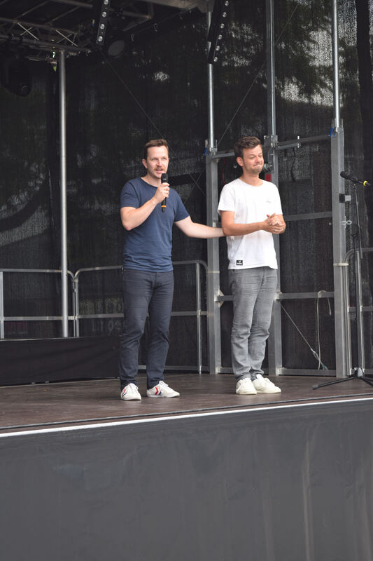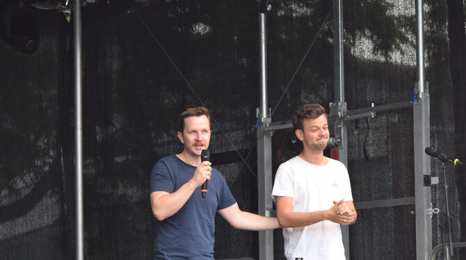 Redekunst beim Büchereifest: Poetry-Slammer Nik Salsflausen (links) und Moderator und Poetry-Slammer Marius Loy beweisen ihre Sprachgewandheit. FOTO: JAENSCH