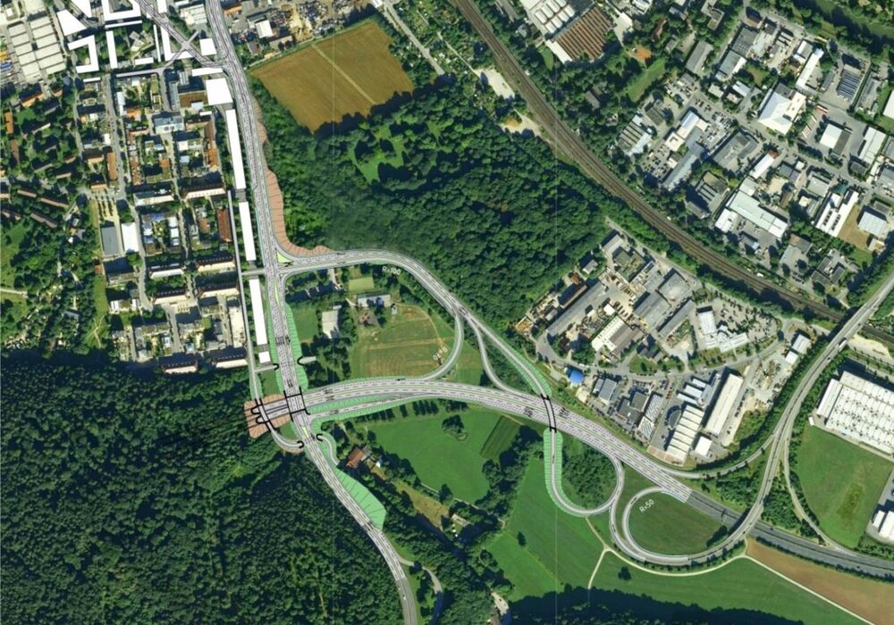 Die Nordausfahrt des geplanten Schindhautunnels: Eine sogenannte Schleifenrampe nach dem Tunnel führt Autofahrer aus Richtung Hechingen und Reutlingen direkter nach Tübingen Mitte. Entlang der Allee des Chasseurs sollen Gewerbebauten (links, weiße Rechtecke) für Lärmschutz des französischen Viertels sorgen. FOTO/GRAFIK: RP