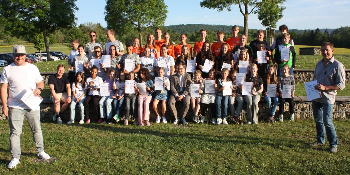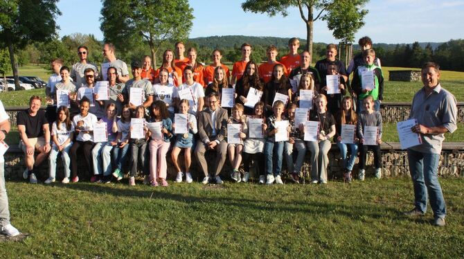 Sportlerehrung Gomaringen mit Bürgermeister Steffen Heß (sitzend, in der Mitte), Stefan Grauer (vorn links) und Stefan Broszeit (vorne rechts).