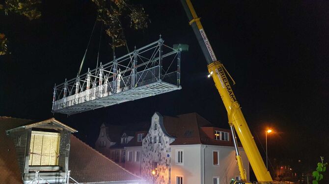 Ein Bagger ist am 18. Oktober an der besagten Fußgängerbrücke hängengeblieben und hat diese aus der Verankerung gerissen. Da der Baggerarm zu weit nach oben ausgefahren war, prallte er damit gegen die Brücke. Anschließend verkeilte sich das Arbeitsgerät. Die Brücke wurde so stark beschädigt, dass sie mit Hilfe von zwei Kränen abgebaut und abtransportiert werden musste. Jetzt befindet sie sich in Derendingen und soll bis Juni 2023 wieder den Kindern den Weg zur Schule verkürzen. Bis dahin sollen die in Mitleidenschaft gezogenen Haupttragelemente repariert werden. Die Reparatur der ursprünglichen Brücke soll zwischen 50.000 und 100.000 kosten. (GEA)