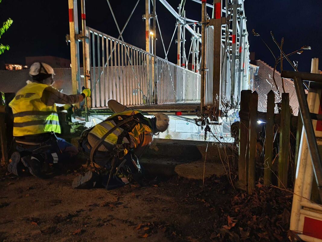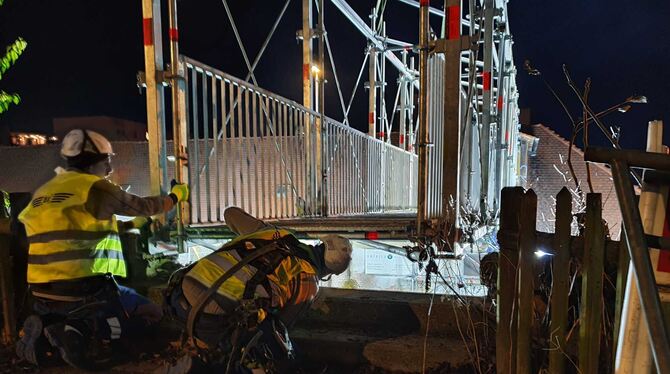 TÜBINGEN. Die Fußgängerbrücke über die Stuttgarter Straße in Tübingen hängt wieder. Zwar handelt es sich nicht um das Original, das im Oktober von einem Bagger beschädigt und aus Sicherheitsgründen abgebaut werden musste, dafür können Schülerinnen und Schüler wieder auf dem direkten Weg zur Schule über die provisorische Behelfsbrücke, die 4,8 Meter über der Straße hängt, gehen. Zusätzlich wurden zwei Kabelbrücken aufgebaut, in beiden Richtungen jeweils 100 Meter vor der Behelfsbrücke, diese sollen die Höhe angeben und vor einem erneuten Unfall warnen. Die Kosten belaufen sich auf rund 10.000 Euro.