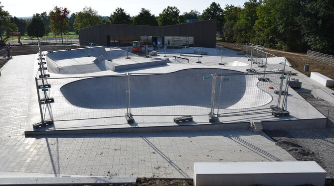 Bald wird der Zaun abgebaut. Das neue Jugendhaus mit Funpark in Gomaringen ist fertig. FOTO: WALDERICH