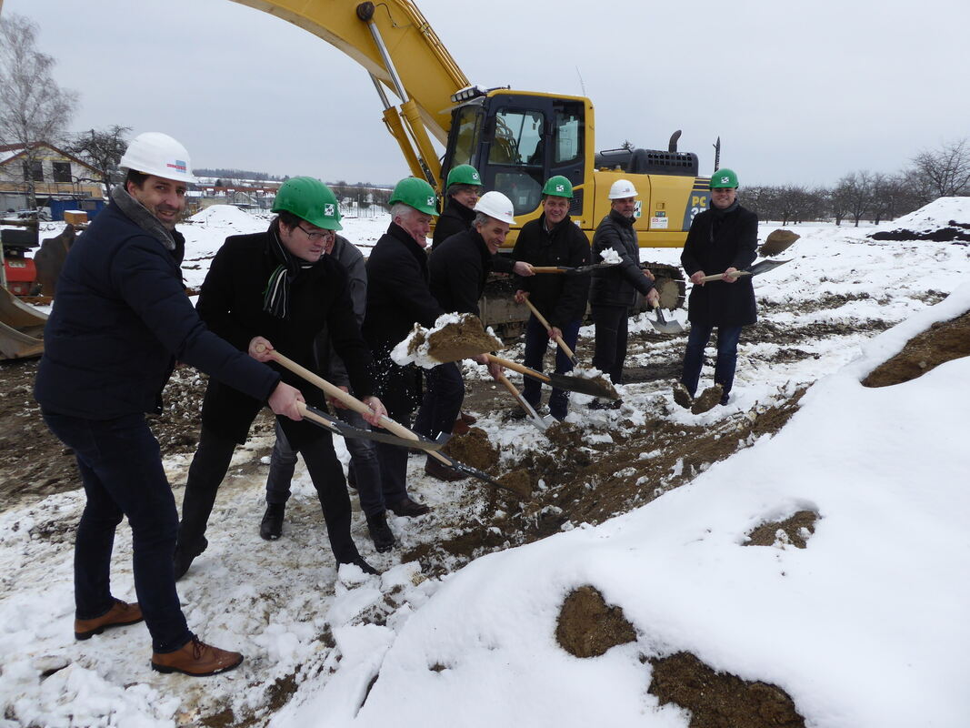 Neun Männer im Schnee: Spatenstich zum offiziellen Beginn des neuen Viertels Gartencarré in Ofterdingen. FOTO: LENSCHOW
