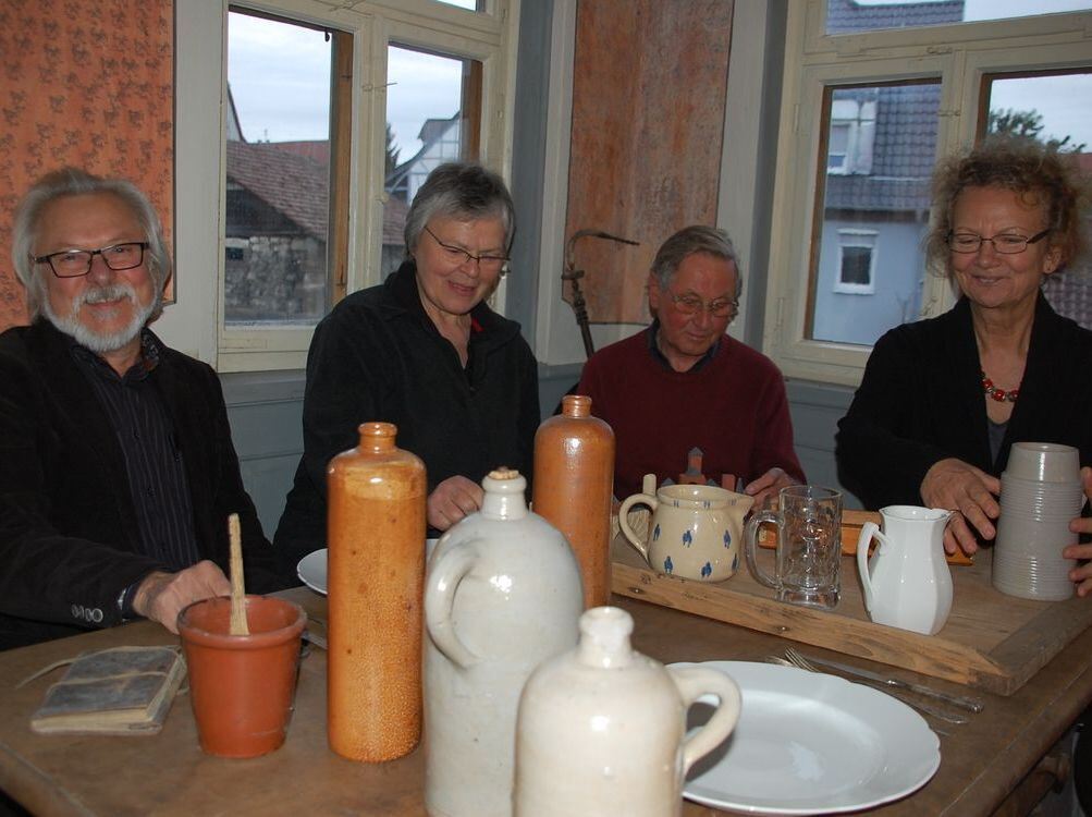 Wolfgang Liese-Grässer, Gabriele Beinert, Manfred Wandel und Eleonore Wittke mit Mostgefäßen in der guten Stube. GEA-FOTO: STÖHR