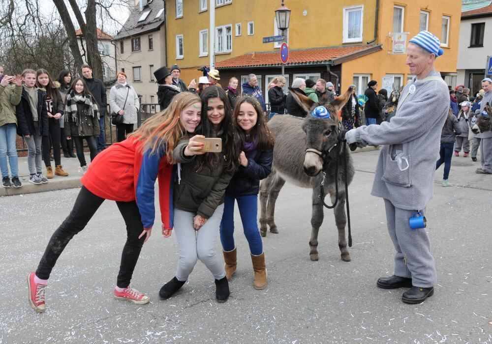 Drei Zicklein und ein Esel nebst närrischem Treiber: Selfie-Impression vom großen Rottenburger Ommzug für die Daheimgebliebenen.