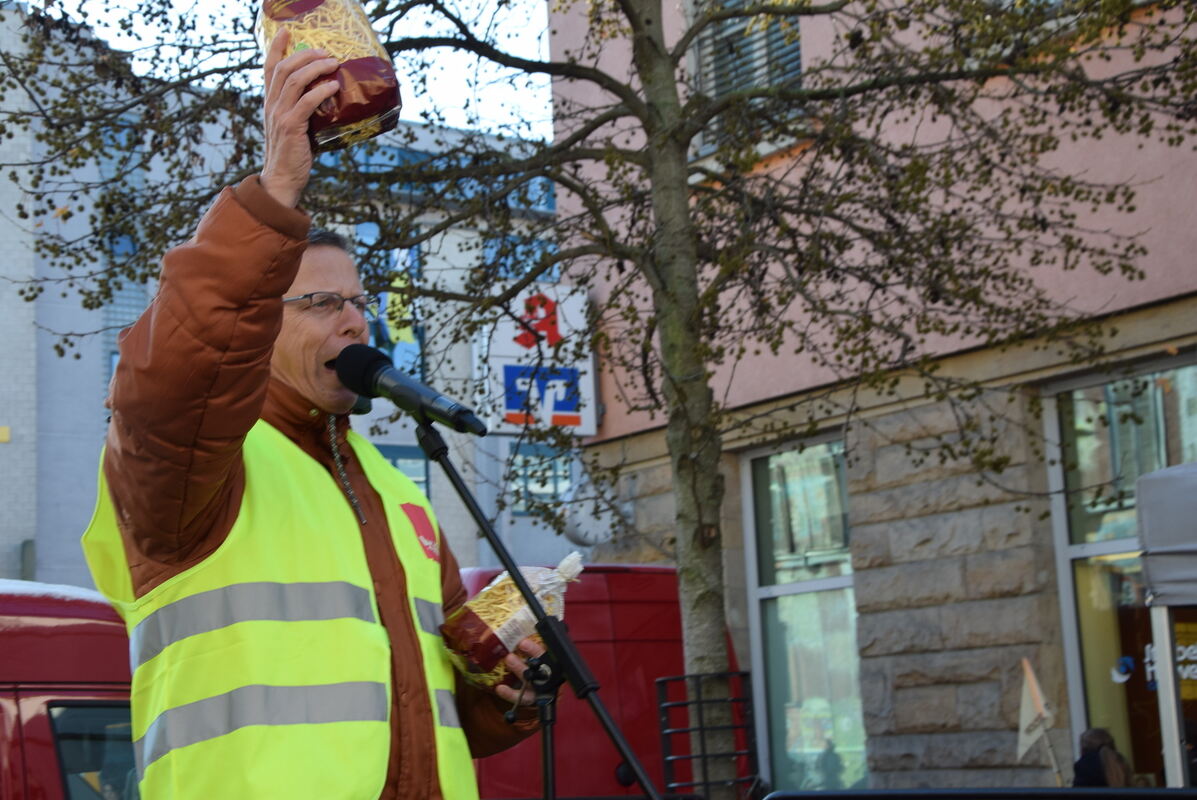 Die Politik müsse für Investitionen sorgen »und nicht um die Macht zocken«, die Arbeitgeber täten gut daran, »in Köpfe zu investieren und nicht in Beton«, findet der Gewerkschafter. Lars Herrmann von der Studierendenvertretung beklagte, dass Studierende nicht mehr als Mindestlohn und Kettenverträge bekommen. Britta Rochier von der Personalvertretung der Uni verwies auf Mehrarbeit und Überstunden. Die Uni-Rektorin habe vor Kurzem die »schlanke Verwaltung« gelobt. Die Frage sei, »wie viel schlank können wir uns leisten, bevor das eine ausgewachsene Magersucht wird?« Maggie Paal aus der Verhandlungskommission wandte sich gegen die Taktik von Arbeitgebern, Beschäftigte mit Einmal-Zahlungen abspeisen zu wollen. Tatsächlich seien manche bereit, sich mit Krümeln abspeisen zu lassen statt das ihnen zustehende Stück vom Kuchen zu fordern. Verdi verlange nicht mehr als faire Bezahlung. (-jk)
