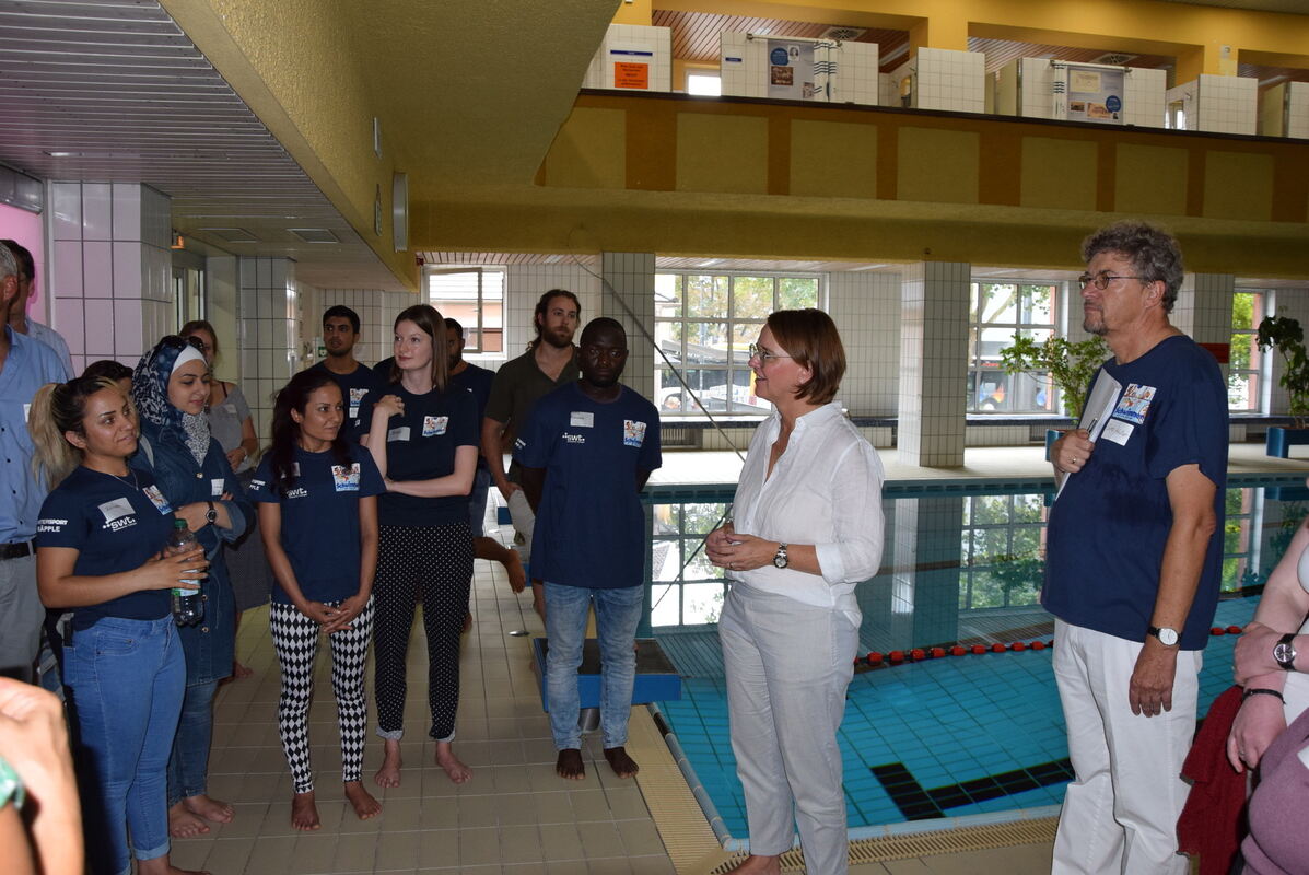 Alle waren gekommen: Projektleiterin Dagmar Müller und Gerd Müller vom Lenkungskreis »Runder Tisch Kinderarmut«, die Trainer Anna Rau und Aiham Shalgin, Ulrich Fischer vom Schwimmverein, Eberhard Roth und Claudia Braun (beide leiten Schwimmschulen), Flüchtlings-Betreuerinnen wie Sylvia Deiß, Anne-Rose Lindel und Barbara Lutz. Sie gaben Erfahrungsberichte und betonten, dass die Kinder selbstbewusster werden und Ermutigung extrem wichtig ist.
