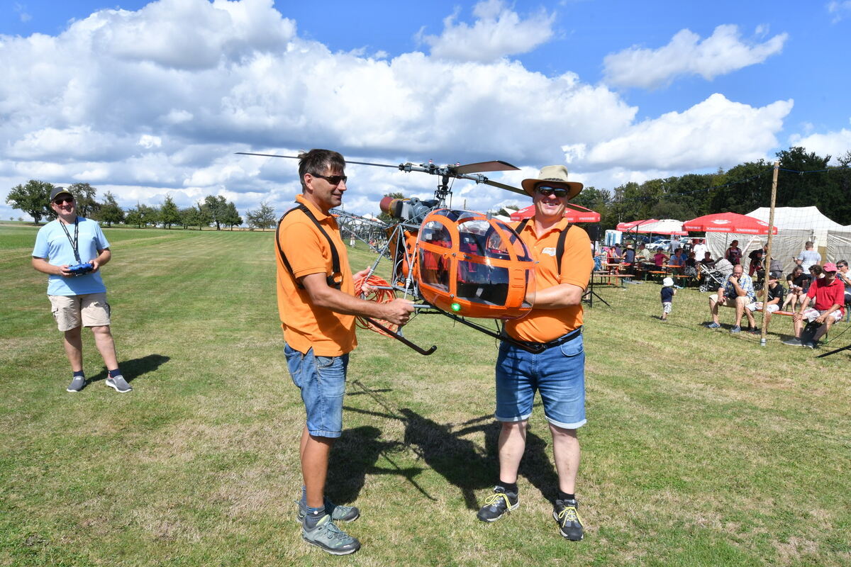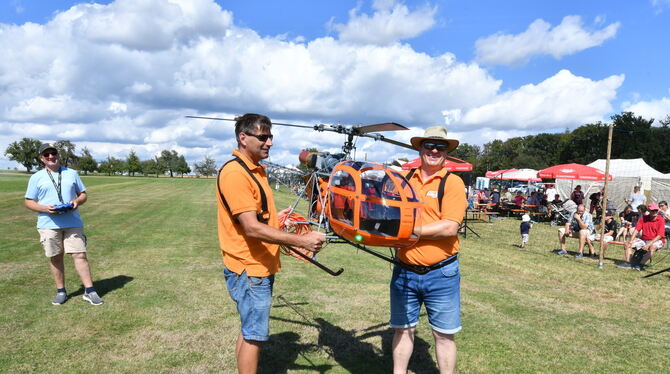 Zu den Animateuren zählten auch Stefan Gaiser und Alexander Hipp mit der Vorführung ihres Lastenhubschraubers Lama 315 SB. Gaiser, der in Walddorfhäslach eine Flugschule betreibt, zeigte dem staunenden Publikum, wozu ein in hundert Arbeitsstunden zusammengebautes Abbild eines Militärhubschraubers im Maßstanb 1:4 in der Lage ist: Mit seinem Co-Piloten ließ er von dem Flugmodell ein Überland-Kabel verlegen. (mey)
