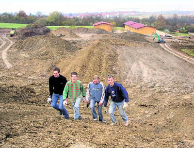 Aufstieg am Starthügel: Philipp Zimmerhakl, Wilco Hailfinger, Franziska Weihing und Benny Hase (von links) erkunden beim Arbeitseinsatz schon mal das Gelände des Gomaringer Bike-Parks, wo sie künftig trainieren werden.