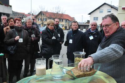 GEA-Leser blickten hinter die Kulissen der Brauerei Fischer. Im Freien gibt es zunächst eine kleine Bier-Lehrstunde durch den Chef Heinrich Fischer, der die Zutaten und die Verarbeitung erläutert. Mehr Bilder in unserer Bildergalerie.