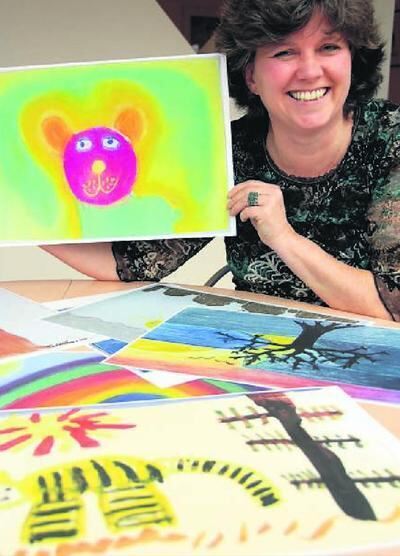 Bilder über Bilder: Die Kunsttherapeutin Kathrin Hillermann zeigt stolz die Arbeiten krebskranker Kinder und Jugendlicher.