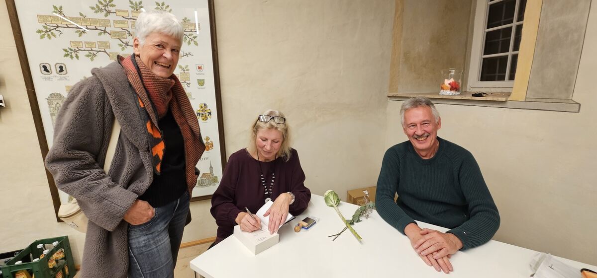 Die Kirchentellinsfurter Autorin Birgit Juresa (Mitte) signiert im Beisein ihres Ehemannes Ivi ihr Buch »Bürotope« für eine Besucherin.