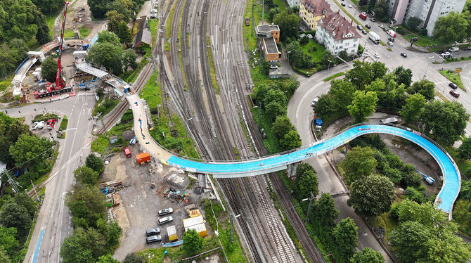 TÜBINGEN. Ein blaues Band für Radfahrer von den Behörden in den Mühlbachäckern hinüber zu den Gymnasien am Anlagenpark: Die Radbrücke West in Tübingen nimmt mehr und mehr Gestalt an. Am Mittwoch wurde das letzte Teilstück eingebaut und die Lücke zwischen den fertigen Teilen diesseits und jenseits der B 28 und der Bahnstrecke geschlossen. Diese Radbrücke ist die dritte von vier neuen in Tübingen, die wichtige Verbindungslücken schließen und miteinander vernetzt werden. Sie ist rund 365 Meter lang und mit einer Fahrbahnheizung ausgestattet.