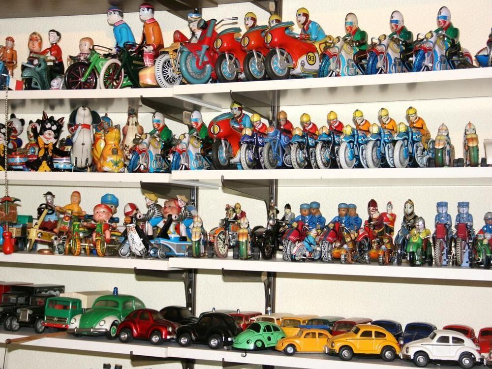 In Reih und Glied sind die Blechspielzeuge angeordnet. Platz für neue Stücke findet der Rentner immer – dann muss halt enger aufgerückt werden.