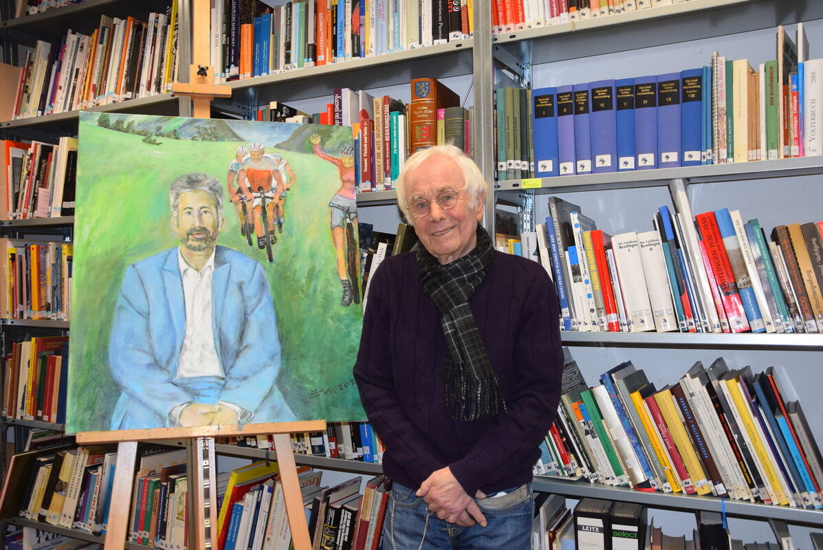 Mücke möchte in seinen Werken die »Seele« des Porträtierten zeigen. »Boris liebt das Grüne und hat eine Freiheit im Denken. Ich sehe ihn häufiger, wie er mit seinem kleinen Kind auf dem Sattel durch die Tübinger Gassen radelt«, sagte der 89-Jährige. »Ich kenne ihn schon sehr lange. Bereits als er mit seinem Vater zusammen Gemüse auf dem Markt verkauft hat.« Palmer habe sich ausdrücklich gewünscht, dass Mücke ihn bereits jetzt angesichts seines hohen Alters porträtiert. Dreimal habe Palmer ihm in seinem Atelier Porträt gestanden. Ernst Mücke stellt häufig Menschen in den Mittelpunkt seiner Bilder. Oft sind es prominente Persönlichkeiten, mit denen sich allgemeine gesellschaftliche oder politische Fragen verbinden. (GEA)