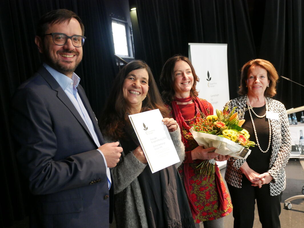 Jochen Richter (links) und Constanze Schemann-Grupp verliehen von der Bürgerstiftung aus den diesjährigen Bürgerpreis an Ute von Querfurth (2. von links) und eine Ehrenamtliche, die ungenannt bleiben wollte.