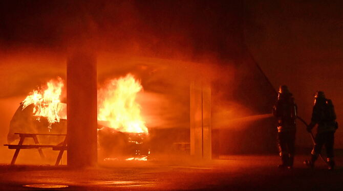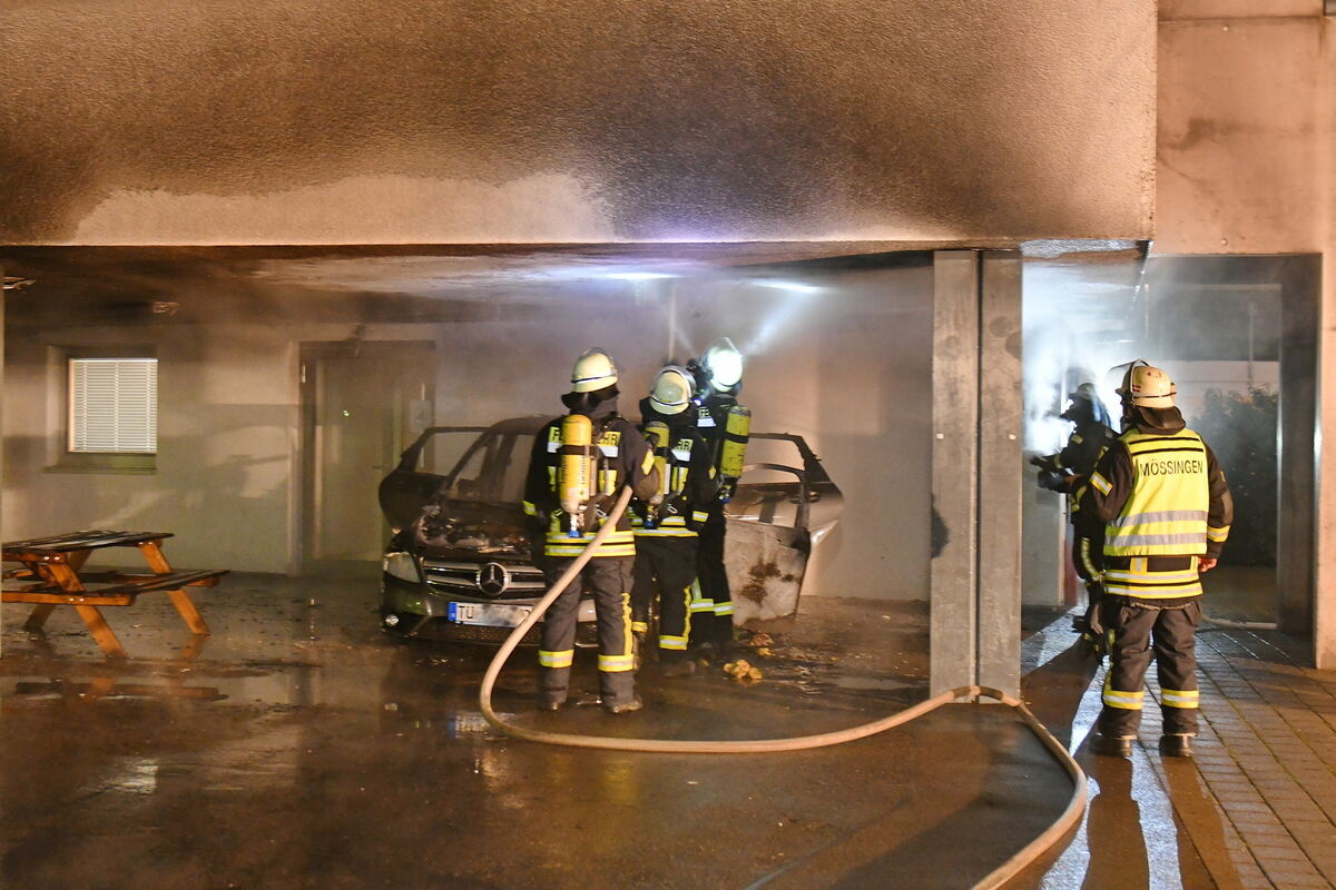 Beim Eintreffen des Löschzuges der Abteilung Stadtmitte stand ein Mercedes der B-Klasse in Flammen. Es bestand die Gefahr des Übergreifens auf das Gebäude, weswegen auch Fahrzeuge des DRK-Rettungsdienstes und der Bereitschaft Mössingen-Ofterdingen alarmiert wurden. Das Auto war verbotenerweise im Laufgang unterhalb der Mensa geparkt, unweit des Eingangs zum zweigeschossigen Gebäude.