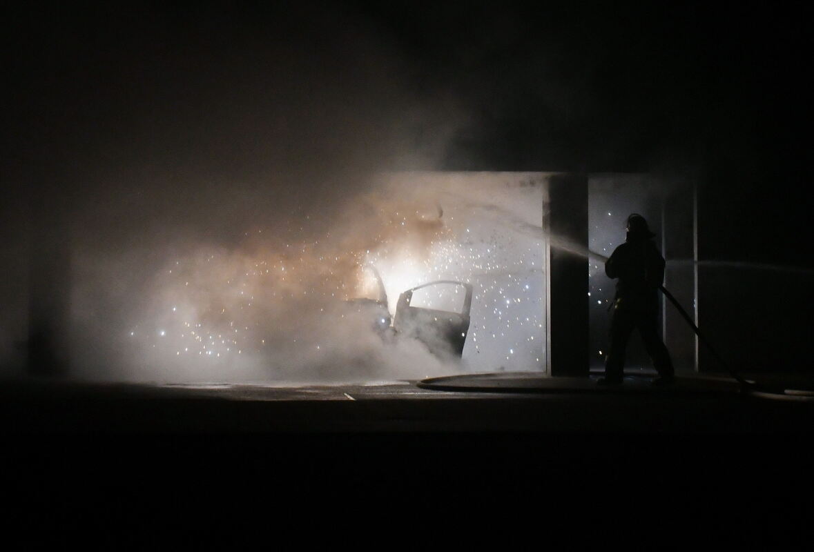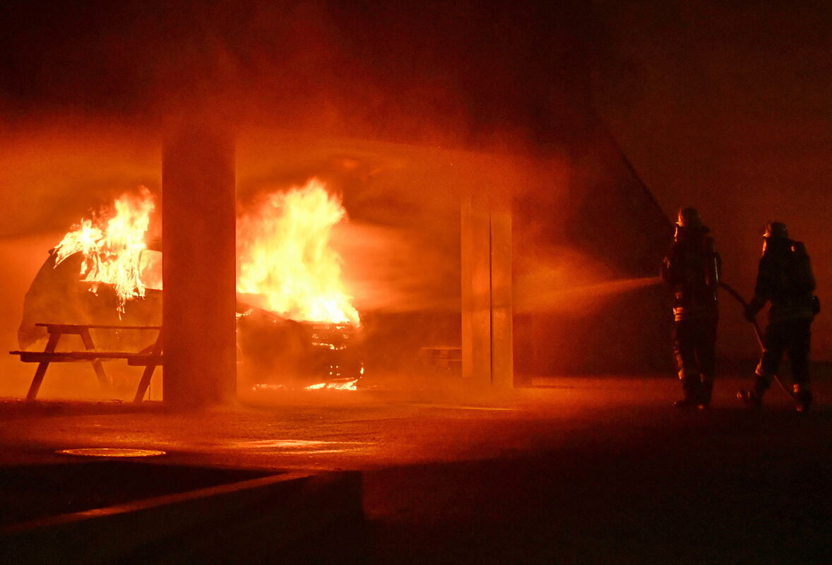 Trotz sofortigem Löscheinsatz brannte das Fahrzeug aus. Wegen zwei kleineren Detonationen mussten die Wehrleute jeweils kurzzeitig zurückweichen. Durch die enorme Hitze wurde die Fassade, die Überdachung und zwei Stützpfeiler beschädigt. Die Feuerwehrhelfer öffneten die verkohlte Deckenverkleidung, um nach Glutnestern zu suchen. Rauch war auch in begrenztem Umfang die Cafeteria eingedrungen. Vermutlich hatte der Wagen einen technischen Defekt.