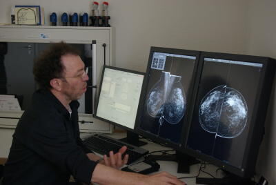 Der Tübinger Radiologe Martin Majer begutachtet auf seinem Rechner die Mammografie einer Brust. Nur wer dies bereis 5 000 Mal gemacht hat, hat die Qualifikation, um als Arzt im bundesweiten Screening-Programm mitzuarbeiten.
