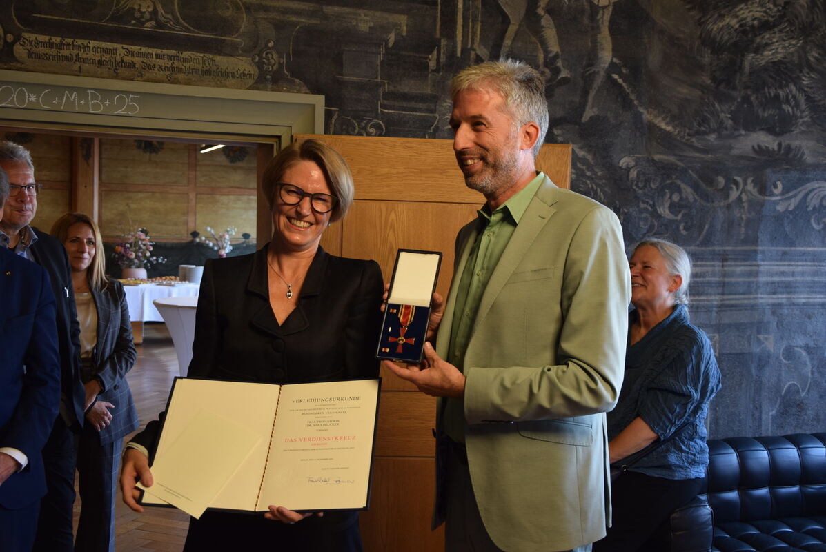 Professorin Dr. Sara Brucker erhält das Verdienstkreuz am Bande der Bundesrepublik Deutschland aus den Händen von Oberbürgermeister Boris Palmer.