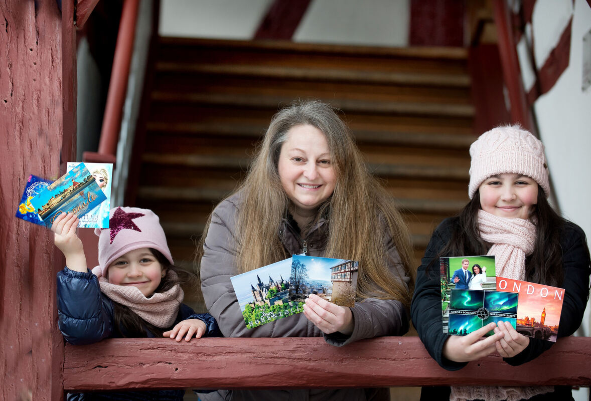 Britta Katsikas-Liewald und ihre beiden Töchter Christina-Marie und Alexia (von links) mit ihren Lieblings-Postkarten. FOTO: TRINKHAUS