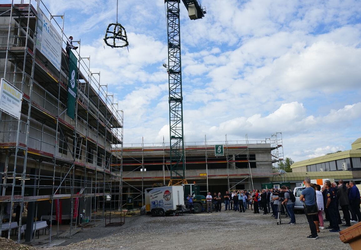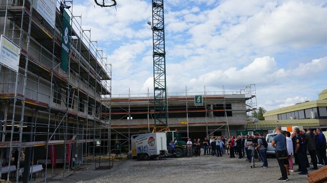 TÜBINGEN. »Die Feierstunde hat geschlagen, es ruht die geübte Hand«, gab Markus Buck, Polier bei der Firma Brodbeck, den Richtspruch aus und kippte ein Glas Rotwein. Die Rohbauten stehen, gehämmert wurde selbst am Freitagnachmittag beim Richtfest noch. Vom Innenhof aus betrachtet links entsteht ein neues Internatsgebäude, rechts wird an die bestehenden Werkstätten und Schulräume der Bildungsakademie Tübingen angebaut. Die Kosten betragen zehn Millionen Euro, Land und Bund geben Zuschüsse. Baubeginn war 2017, Fertigstellung wird voraussichtlich 2019 sei. Die Eröffnung könnte sich aber durchaus auf 2020 verzögern, berichteten Planer.