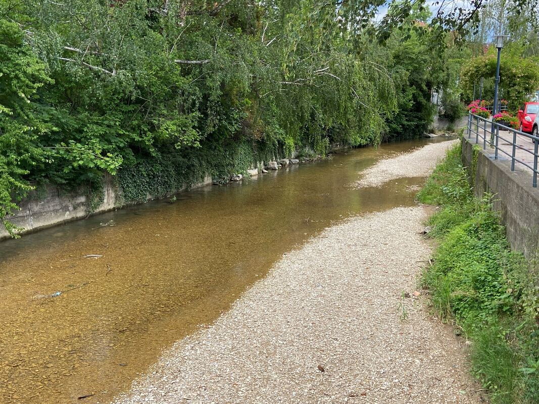 Könnte schöner sein: Einen ansteigenden Uferbereich mit Steinen statt einer Betonmauer wünscht sich die CDU für die Steinlach am Mühlengärtle, auch wenn dafür Parkplätze wegfallen. FOTO: FÖRDER