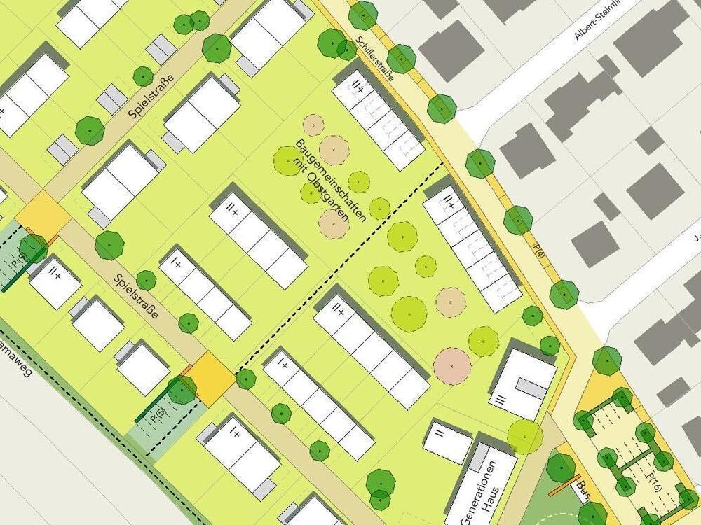 Wohnen im Grünen: Um die Obstbäume (grüne und rosa Kreise) herum sollen Reihenhäuser entstehen. GRAFIK: KRISCH PARTNER