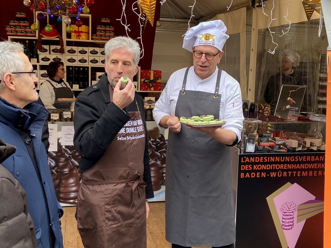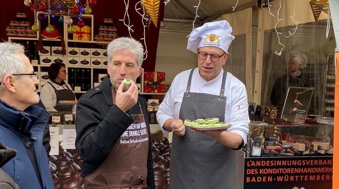 Vier Tage hätten Mitarbeiter, Helfer und Marktbeschicker ihre rund 80 Stände aufgebaut und zu dem Bild zusammengefügt, das sich nun Bürgern und Besuchern gleichermaßen eröffnet: weiße, spitze Zelte und überbordende Auslagen voll bunter Schokoladen-Kreationen zieren noch bis Sonntag die Altstadt. Ganz zeitnah und modern mit dabei: Variationen der beliebten »Dubai-Schokolade«, die Konditormeister Johannes Becker dem Bürgermeister nach seiner Rede präsentierte. Die grüne Farbe des Macaron-Gebäcks, die von den Pistazien stammt, interpretierte Palmer als Seitenhieb auf seine ehemalige Partei: »Ich dachte, Sie wollten mir damit was sagen!«, rief er zur Belustigung der Zuschauer. (GEA)