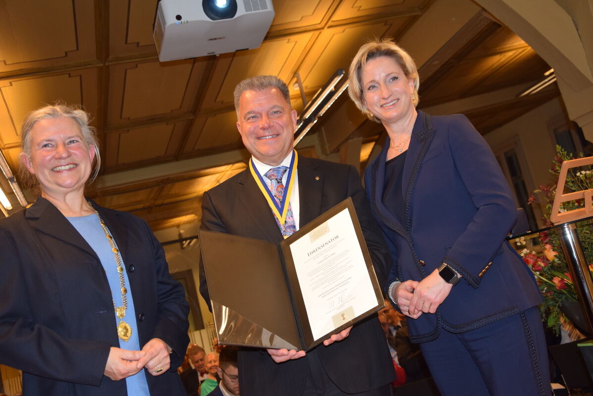 Christian O. Erbe bei der feierlichen Verleihung mit Ministerin Nicole Hoffmeister-Kraut (rechts) und Uni-Rektorin Karla Pollmann (links).