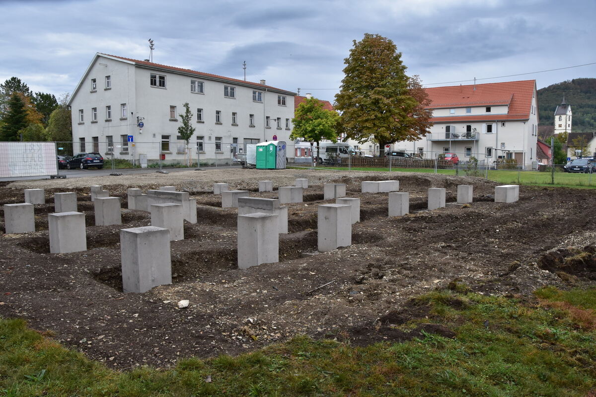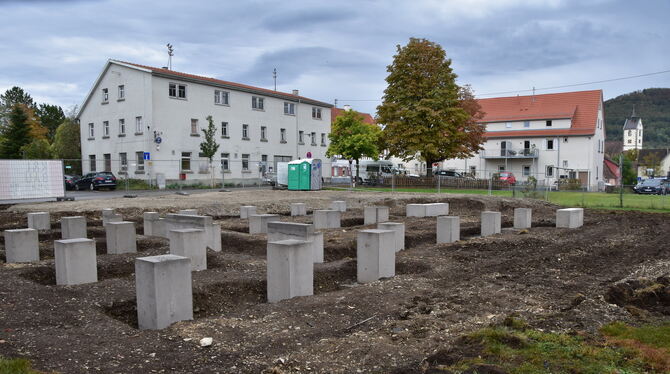 MÖSSINGEN. Sieht aus wie ein Kunstwerk oder erinnert an ein Mahnmal. Doch was derzeit in der Mössinger Höfgasse auf einer bislang unbebauten Wiesenfläche neben dem Biergarten der Pizzeria »Löwen« aus dem Boden ragt, ist erst noch im Entstehen. Hier werden dieser Tage die Betonfundamente für eine Containerlage erstellt. Wie berichtet, errichtet die Tübinger Kreisbaugesellschaft im Auftrag des Landkreises eine Sammelunterkunft für Geflüchtete. Nach bisherigen Planungen sollen dort bis Jahresende zwanzig Personen einziehen. Welche Gruppen und Nationalitäten das sein werden, lässt sich nicht planen, weil die Geflüchteten kurzfristig aus den Landeserstaufnahme-Einrichtungen auf die Kreise verteilt werden. Momentan bekommt Tübingen monatlich rund 140 Wohnungssuchende zugewiesen. Der Landkreis muss die neu Angekommenen in Gemeinschaftsunterkünften und, wenn vorhanden, in Wohnungen unterbringen. Diese »vorläufige Unterbringung« ist bislang auf 24 Monate begrenzt und endet in der Regel mit dem rechtskräftigen Abschluss des Asylverfahrens.