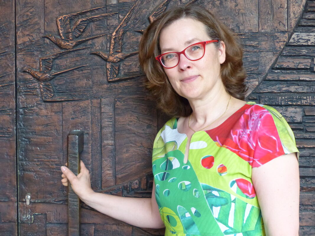Dörte Pape an der Tür der Friedenskirche in Tübingen, wo die Philippus-Gemeinde ihre Gottesdienste feiert. FOTO: WEBER