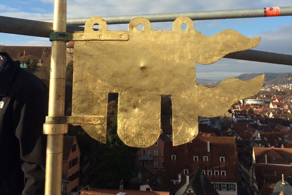 TÜBINGEN. Hoch über den Dächern wird's auch manchem neugierigen Journalisten mulmig. Die Zimmerleute grinsen freundlich und denken sich ihren Teil. 35 Meter über dem Straßen-Niveau der Haaggasse wird soeben der letzte Teil der Rathaus-Sanierung beendet. Der Dachreiter aus dem Jahr 1511 steht wieder fest, demnächst kann das Glockenspiel installiert werden.