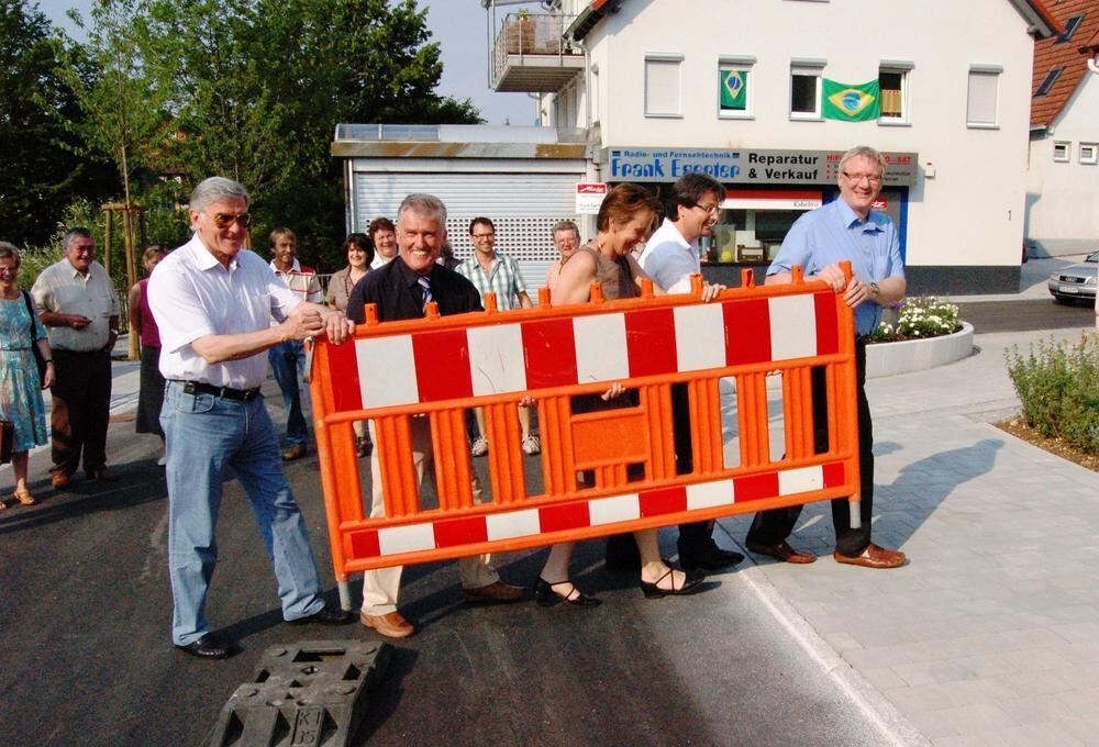 Weg mit dem Ding: Für den offiziellen Termin hatte Bürgermeister Joseph Reichert (zweiter von links) eigens eine Verkehrsbake besorgt, die er dann mit Architekten und Vertreter der Baufirmen feierlich von der Straße räumte.