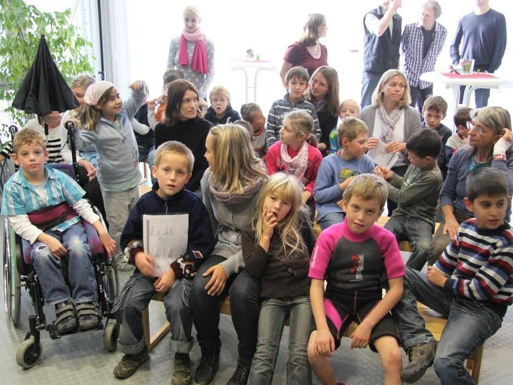 Schüler der neuen Dreifürstenstein-Grundschule für behinderte und nicht behinderte Kinder bei der Einweihungsfeier, mit dabei auch die neue Lehrerin Vera Heinzelmann (zweite Reihe, Zweite von links). Die Kinder zeigten später ein Jahreszeiten-Schattenspiel.
