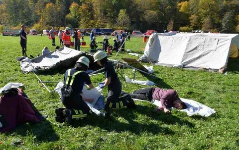 An der Straße von Tübingen nach Bebenhausen proben Rettungs- und Hilfskräfte vom DRK und THW den Ernstfall, versorgen viele Verletzte an der Unglücksstelle.