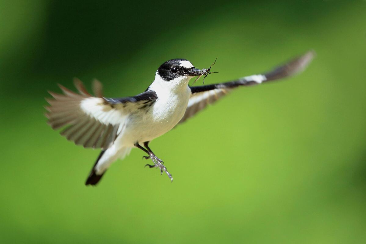 MÖSSINGEN. Geradezu grazil mutet dieser Beutezug an: Mit zu Fächern entfalteten Federn schwebt der zarte Vogel durchs satte Grün, die Füßchen erhaben ausgestreckt – genau so, wie die im Schnabel klemmende Fliege. Um eine solch exakte Detailaufnahme aus dem Leben des Halsbandschnäppers aufs Bild zu bannen, bedarf es ein wenig Glück und einiges an Sachkenntnis.