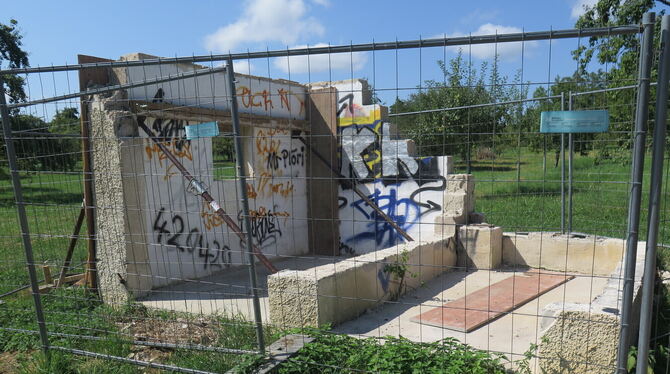 OFTERDINGEN. Der Sockel ist noch da. Teile der noch übrigen Wände sind stehen geblieben, sie sind bemalt mit Graffiti. Ein Bauzaun hält Neugierige davon ab, den Resten allzu nahe zu kommen. Das Schützenhäusle in Ofterdingen ist abgebrochen worden.