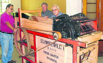 Lange stand die Maschine vergessen in einem Eck: Lothar Windhösel, Manfred Pflumm und Siegfried Deiß (von links) haben sie wieder in Ordnung gebracht.
