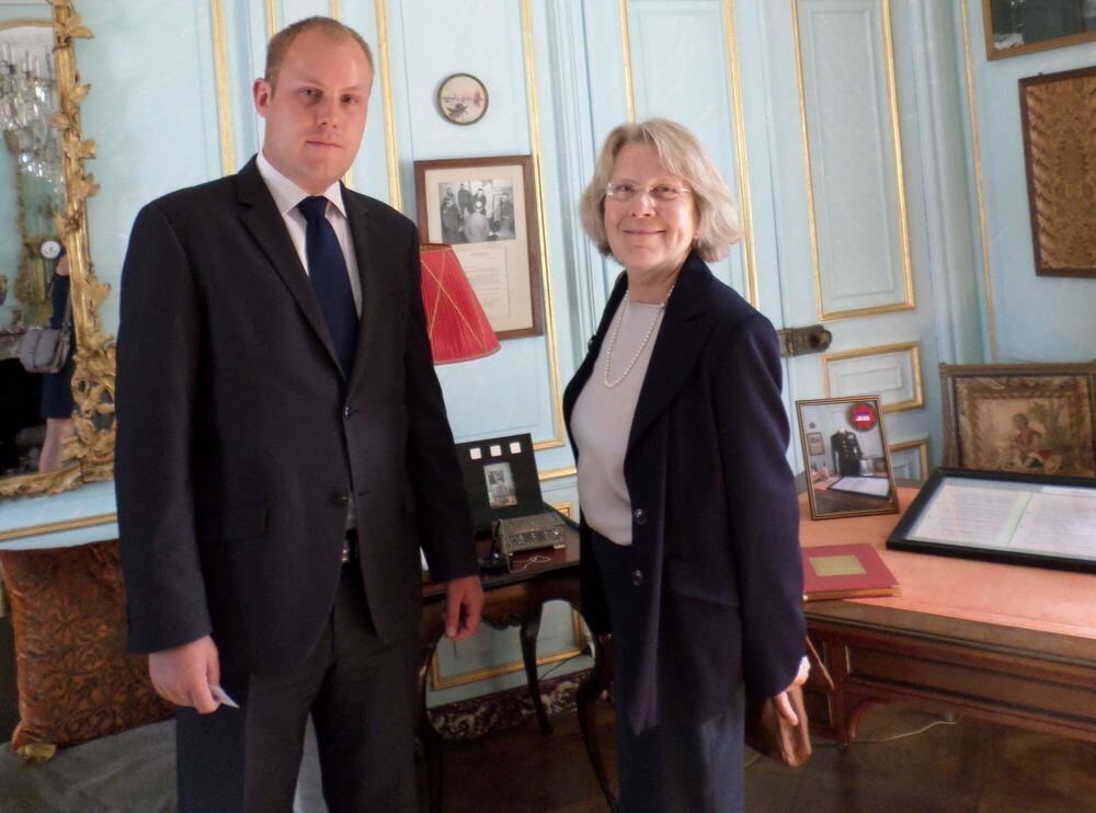 Historischer Moment: jüngster und ältester Enkel von Karl-Wilhelm von Schlieben an jenem Tisch, an dem vor 70 Jahren die Kapitulationsurkunde unterschrieben wurde. FOTO: PRIVAT
